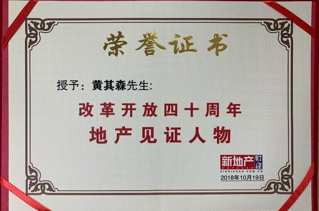 10月19日,主题为“横盘、长效、探寻新增长极”的第十四届中国地产金融年会在北京召开,泰禾集团董事长黄其森获得主办方新地产财经颁发的“改革开放40年地产见证人物”奖。
