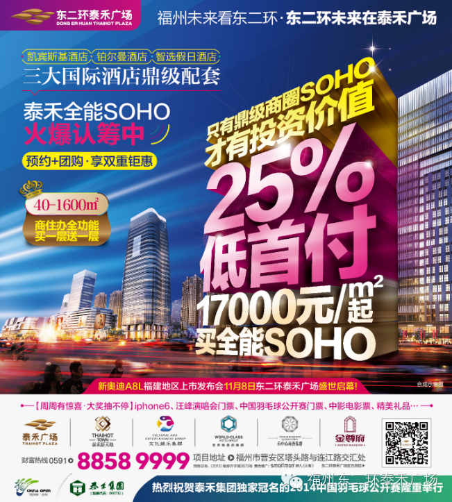 东二环泰禾广场【周周有惊喜 大奖抽不停】活动每周末持续火爆进行中!只要您到访并参观SOHO样板房,即有机会赢取汪峰演唱会门票、中国羽毛球公开赛门票、中影电影票、精美礼品等丰厚大奖!