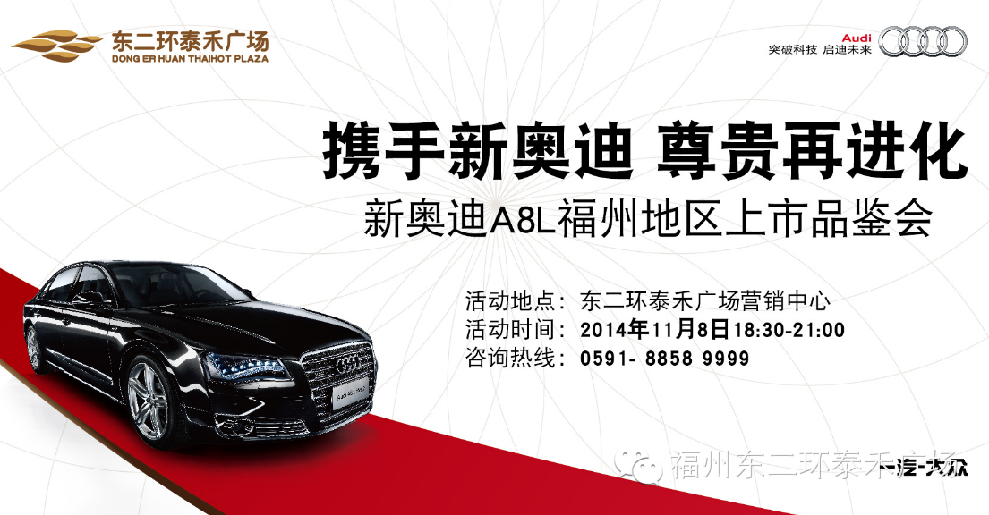 11月8日,新奥迪A8L福州地区上市品鉴会尊贵登场!“尊贵”将在东二环泰禾广场被再次赋予新的内涵。新奥迪A8L,感受未来,尊贵再进化。邀您体验顶级座驾!