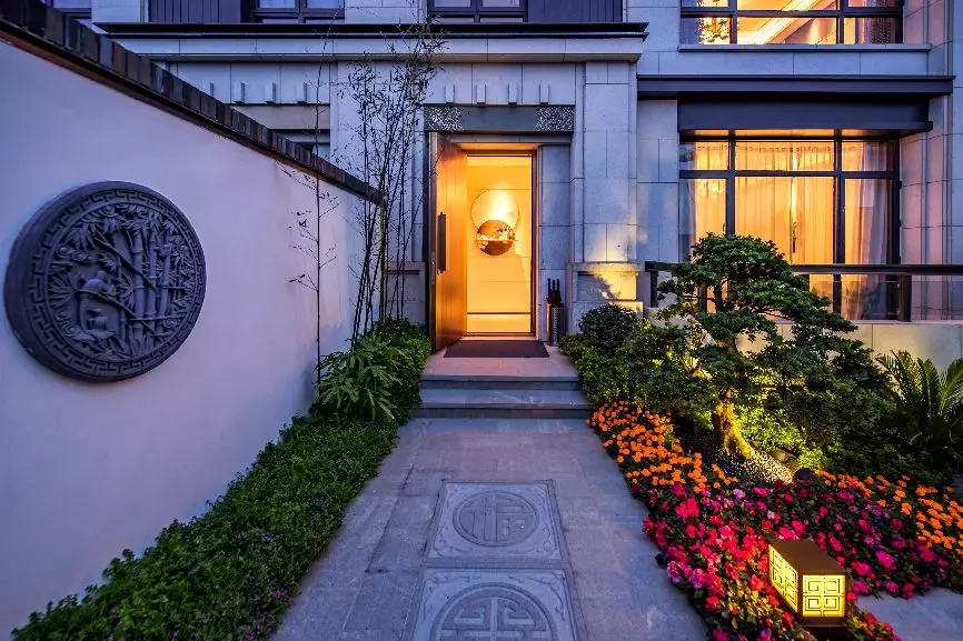大门将古代狮口门环演变为方正硬朗的雕花把手,大门以传统门饰元素、规整的镶嵌代替传统门钉,形成独特的一套新中式门钹装饰体系。